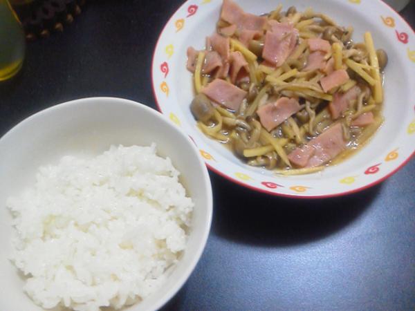 今日の夜飯はベーコンとしめじと筍の水煮の炒め物をつくりまんた
